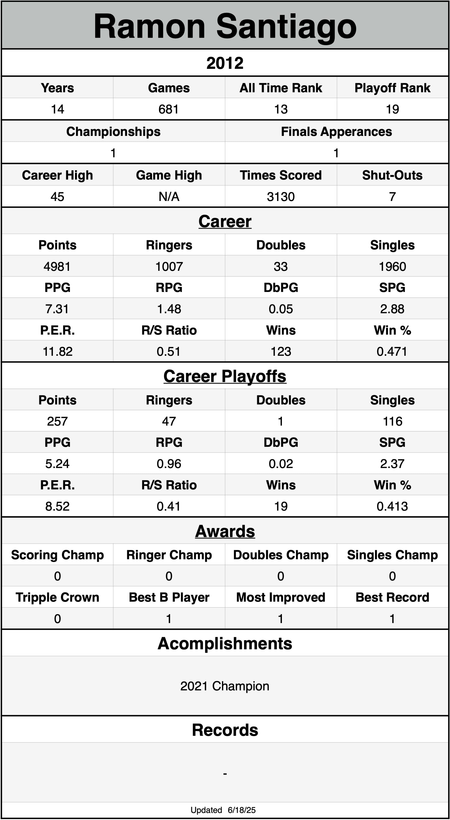 P.E.R. may currently be listed lower than actual P.E.R. for seasons without shut-out data