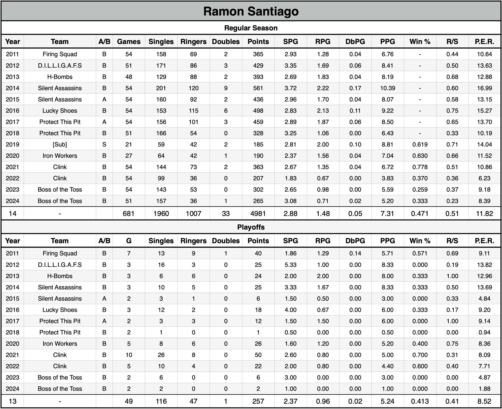 P.E.R. may currently be listed lower than actual P.E.R. for seasons without shut-out data