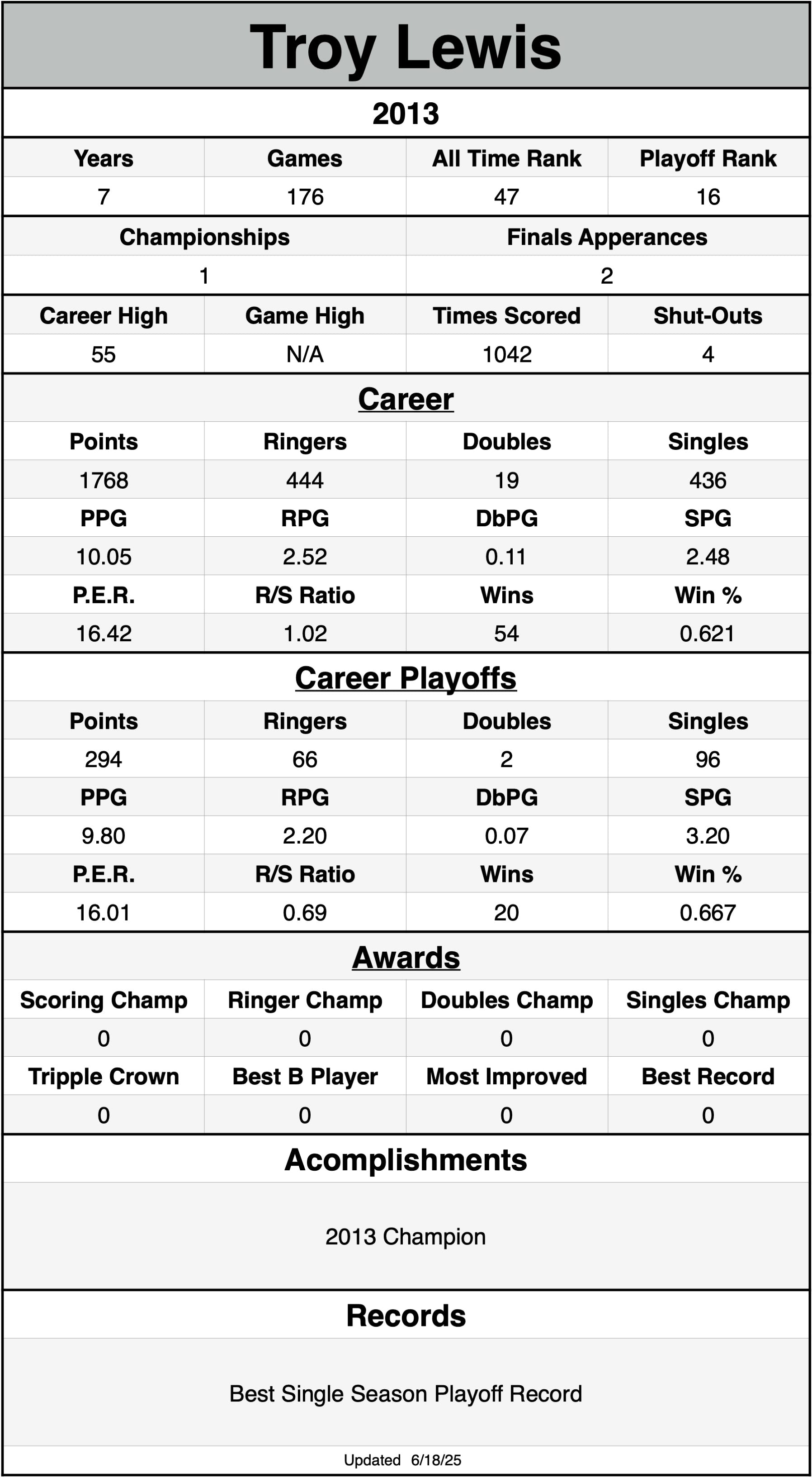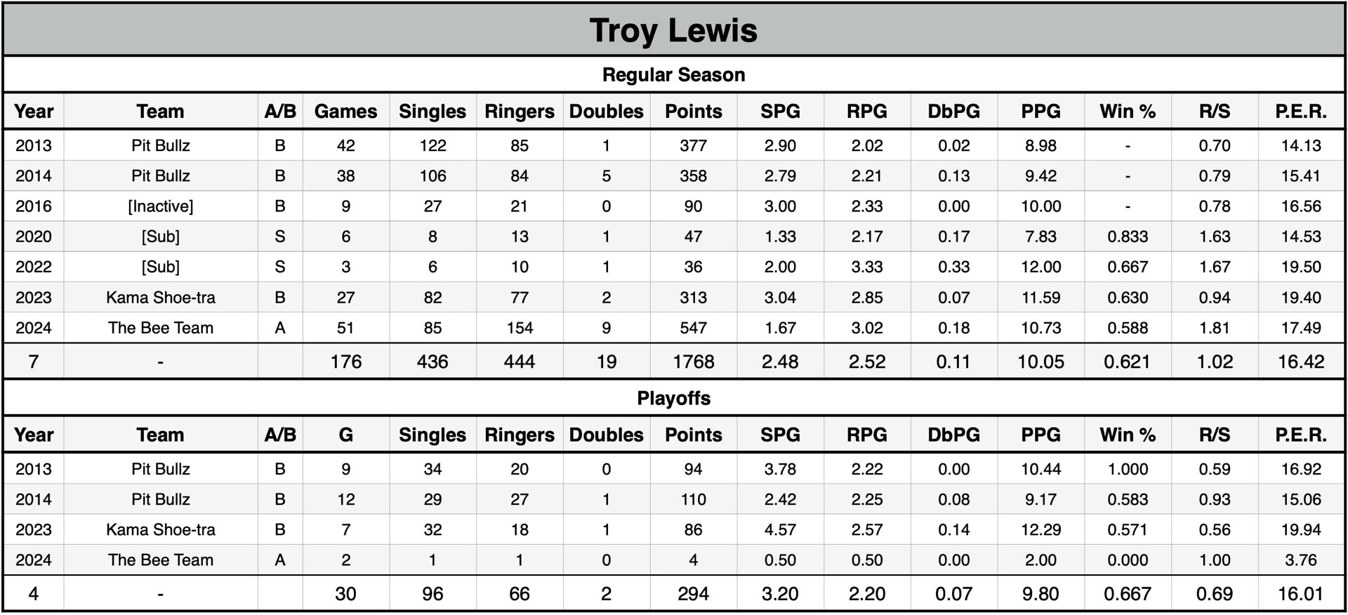 P.E.R. may currently be listed lower than actual P.E.R. for seasons without shut-out data